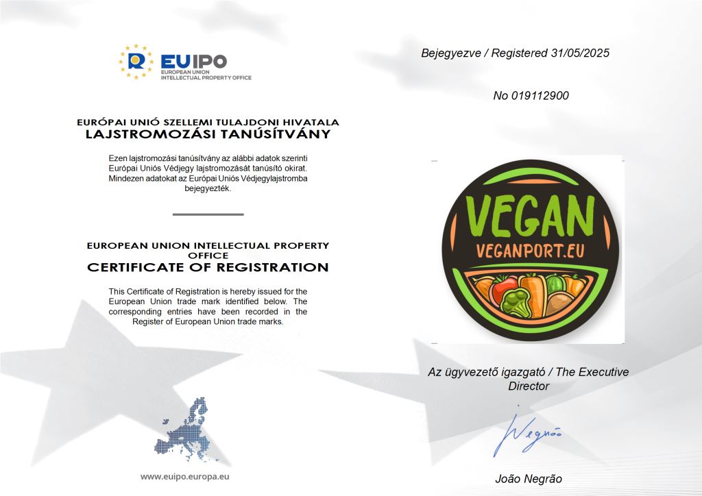 Bemutatjuk az Európai Unió Szellemi Tulajdoni Hivatalának (EUIPO) hivatalos tanúsítványát és engedélyét, amely feljogosít minket a Veganport.eu Vegán Védjegy kiadására.
